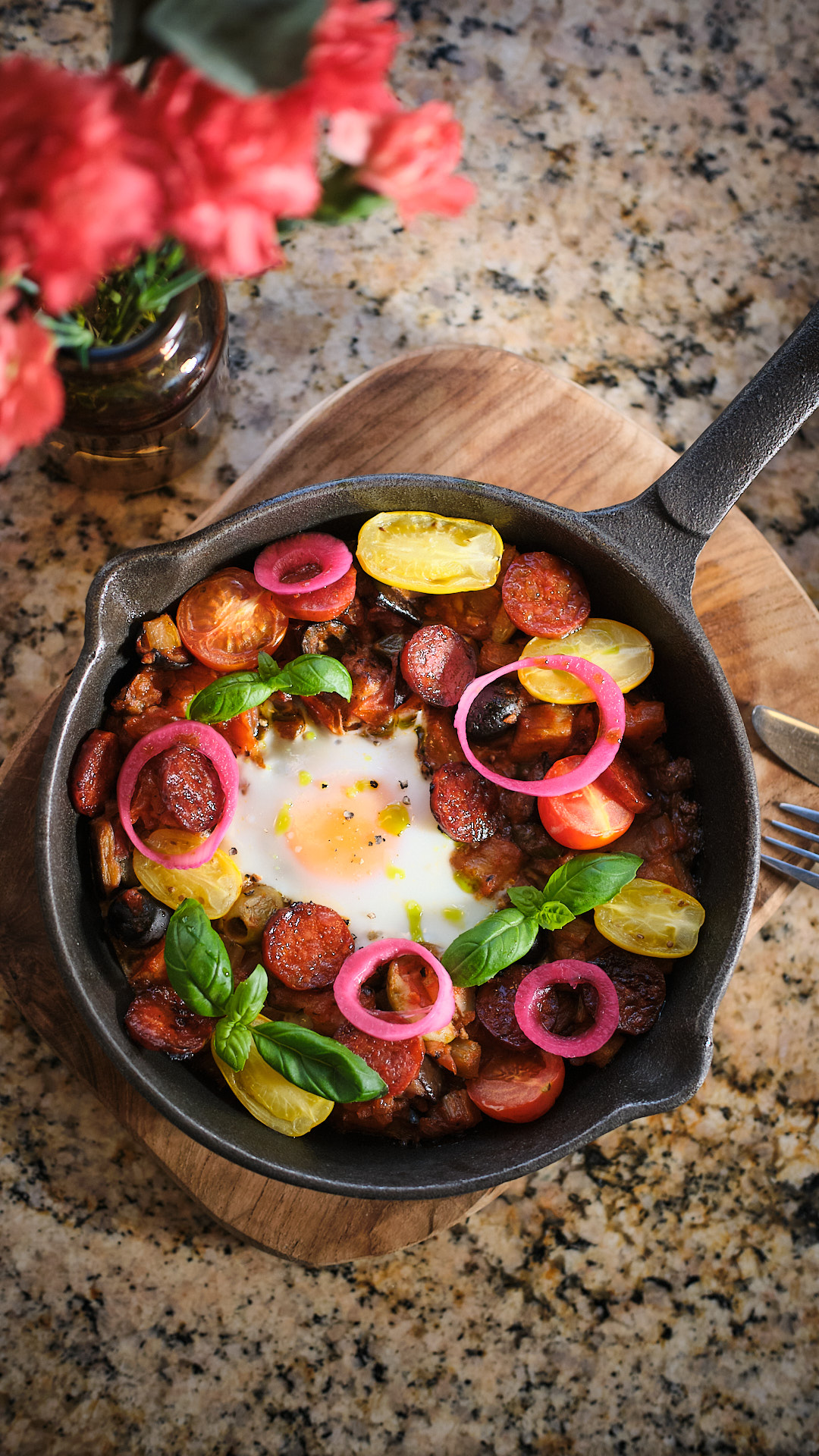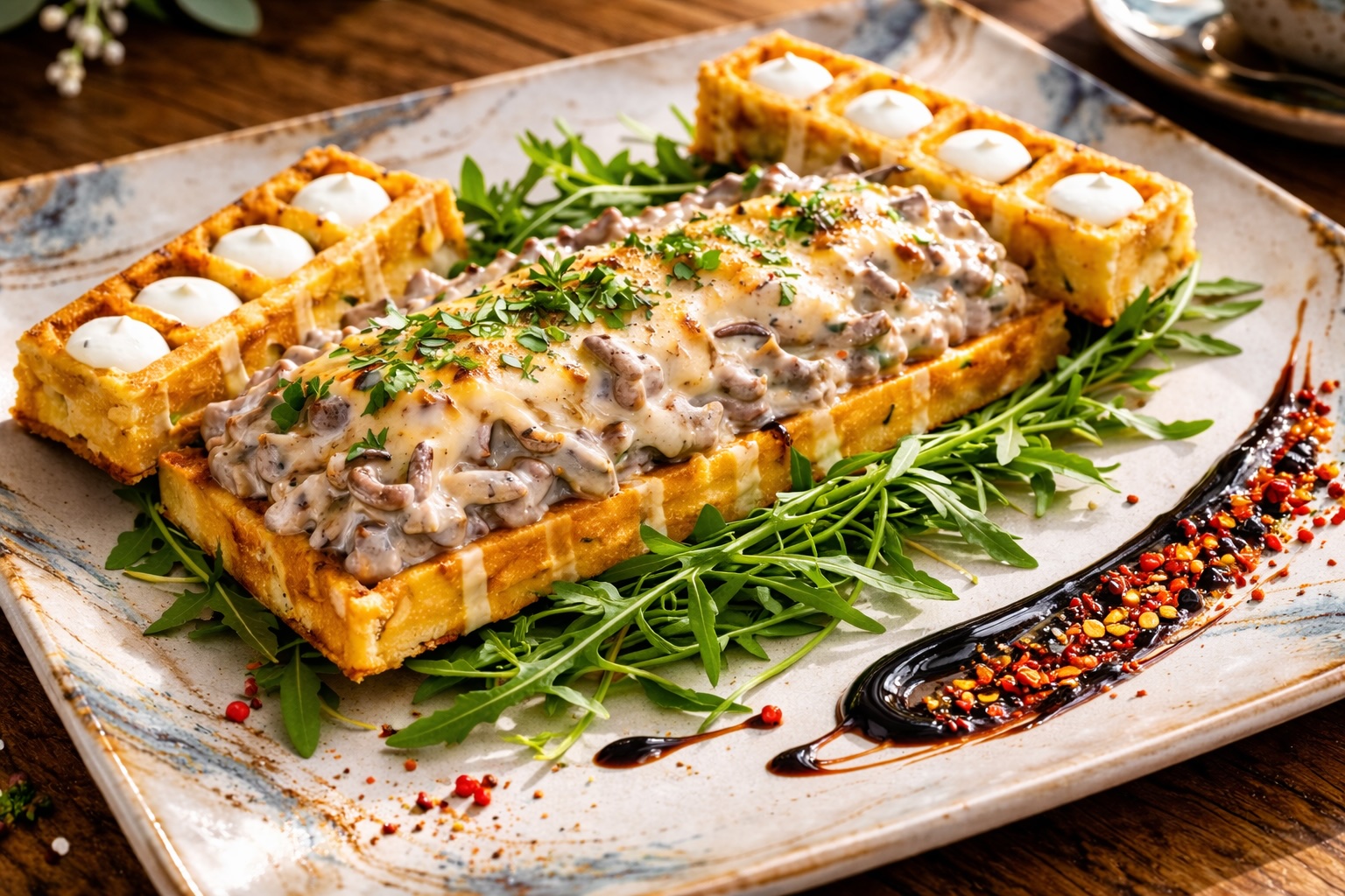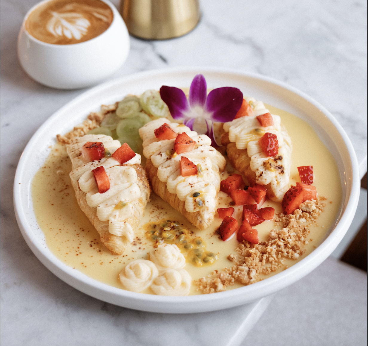 Tutaj śniadania to prawdziwa podróż smaków – pełna aromatów, świeżych składników i tropikalnych akcentów. W Menu A czeka proteinowa ciabatta z kurczakiem – na bazie ciabatty z dodatkiem nasion i serka cottage, podana z hummusem z zielonego groszku według sekretnej receptury Chefa, soczystym szarpanym kurczakiem w kremie pomidorowo-cebulowym, świeżą sałatą, dojrzałymi pomidorami, startym serem i domowym winegretem miodowym, który nadaje daniu wyrazistej świeżości. Menu alternatywne to coś dla miłośników deserów – croissant brûlée z marakują, z kremem pâtissière subtelnie aromatyzowanym wanilią, świeżymi owocami i delikatną karmelizowaną warstwą brûlée, która łączy chrupkość z aksamitną konsystencją. Obłęd!