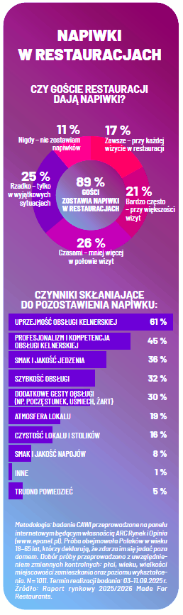 Kultura napiwków w polskiej gastronomii ewoluuje szybciej niż sama struktura rynku. To już nie tylko symboliczny gest gościa, lecz także element o wyraźnym wymiarze ekonomicznym, psychologicznym i wizerunkowym. Dane z raportu Made For Restaurant 2025/2026 pokazują, że napiwki stały się jednym z kluczowych wskaźników jakości obsługi oraz realnym narzędziem zarządzania personelem. Dla wielu restauracji to również istotny komponent modelu wynagrodzeń, wpływający na retencję pracowników, poziom motywacji i finalne doświadczenie klienta.